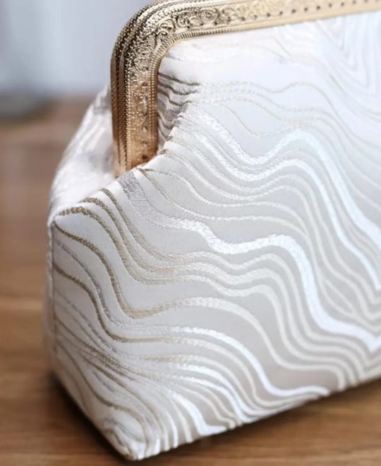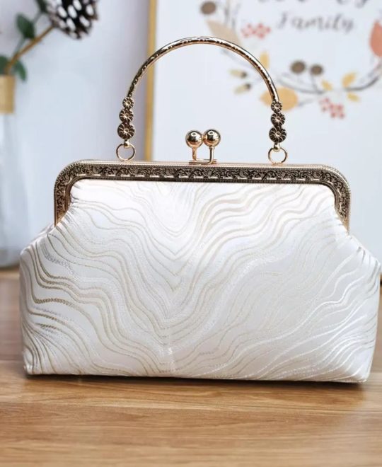 $2876Short Description Ivory satin-jacquard with flowing ripple textures, framed by an engraved gold metal kiss-lock and a floral-etched top handle—elegant, luminous, and wedding-ready. Key Highlights Engraved frame & kiss-lock: Polished gold hardware with a crisp, secure click. Ripple jacquard exterior: Textured waves catch the light for depth and refinement. Carved top handle: Comfortable arc with […]