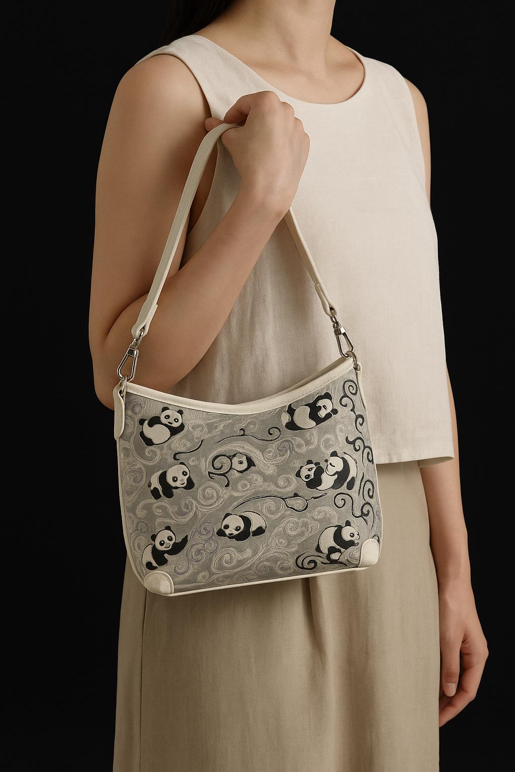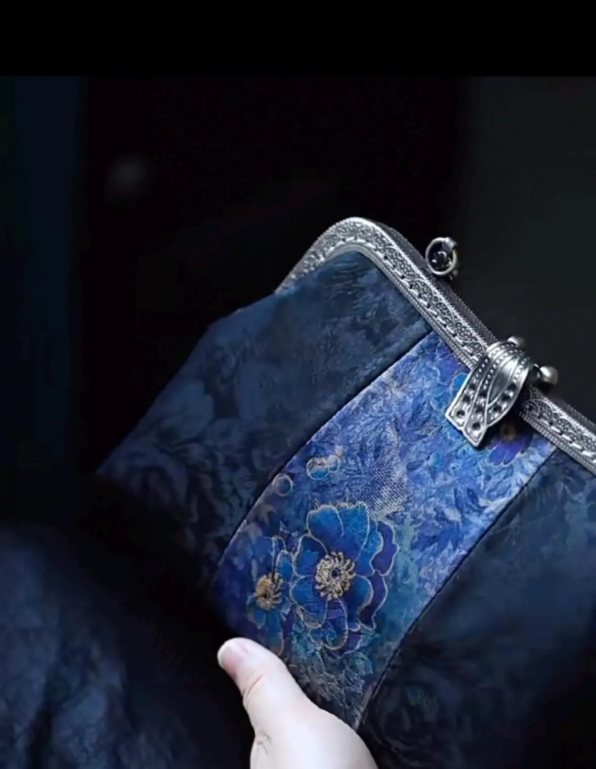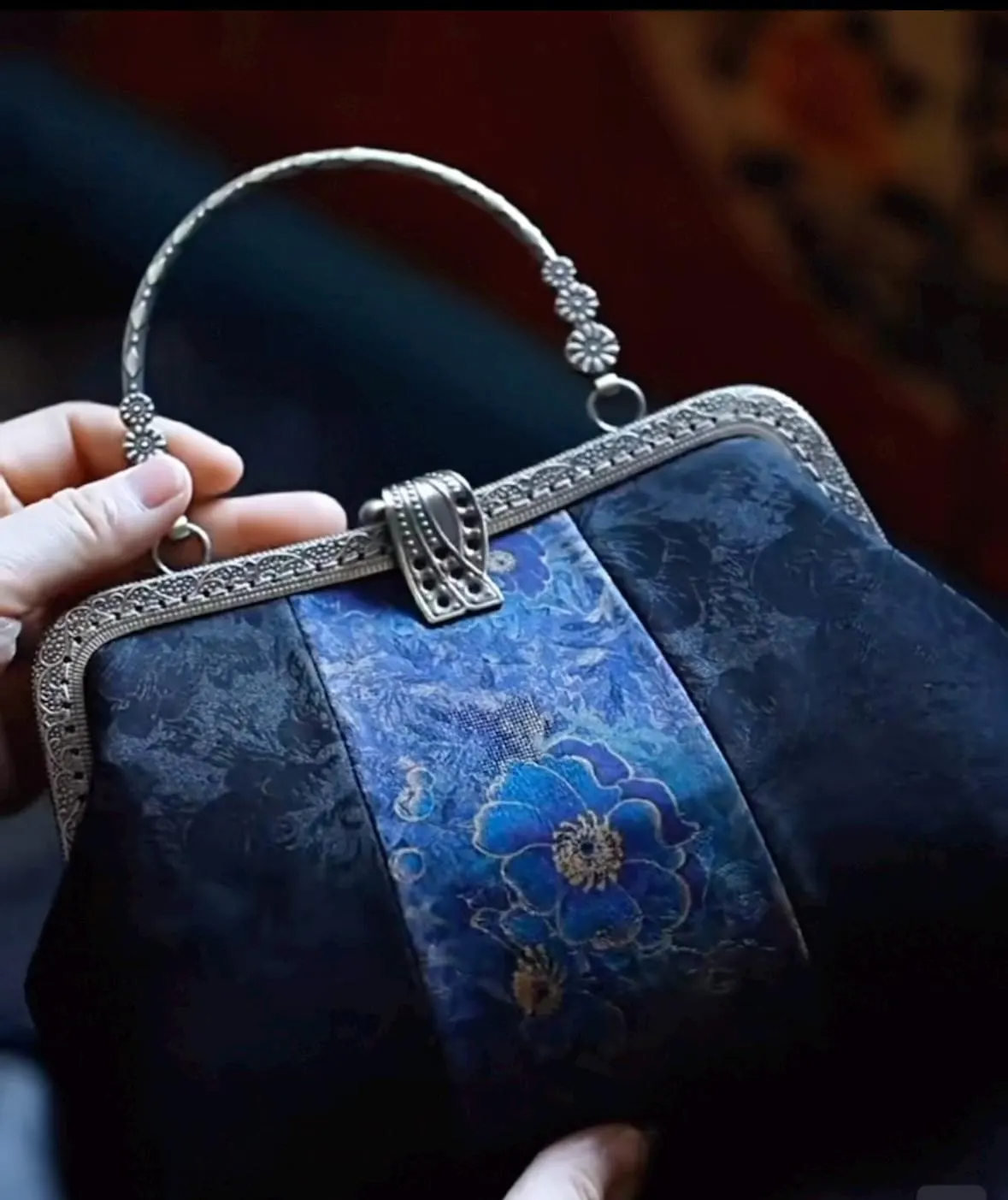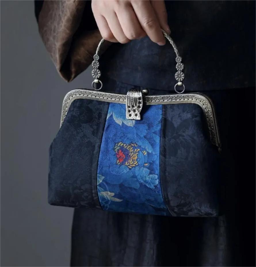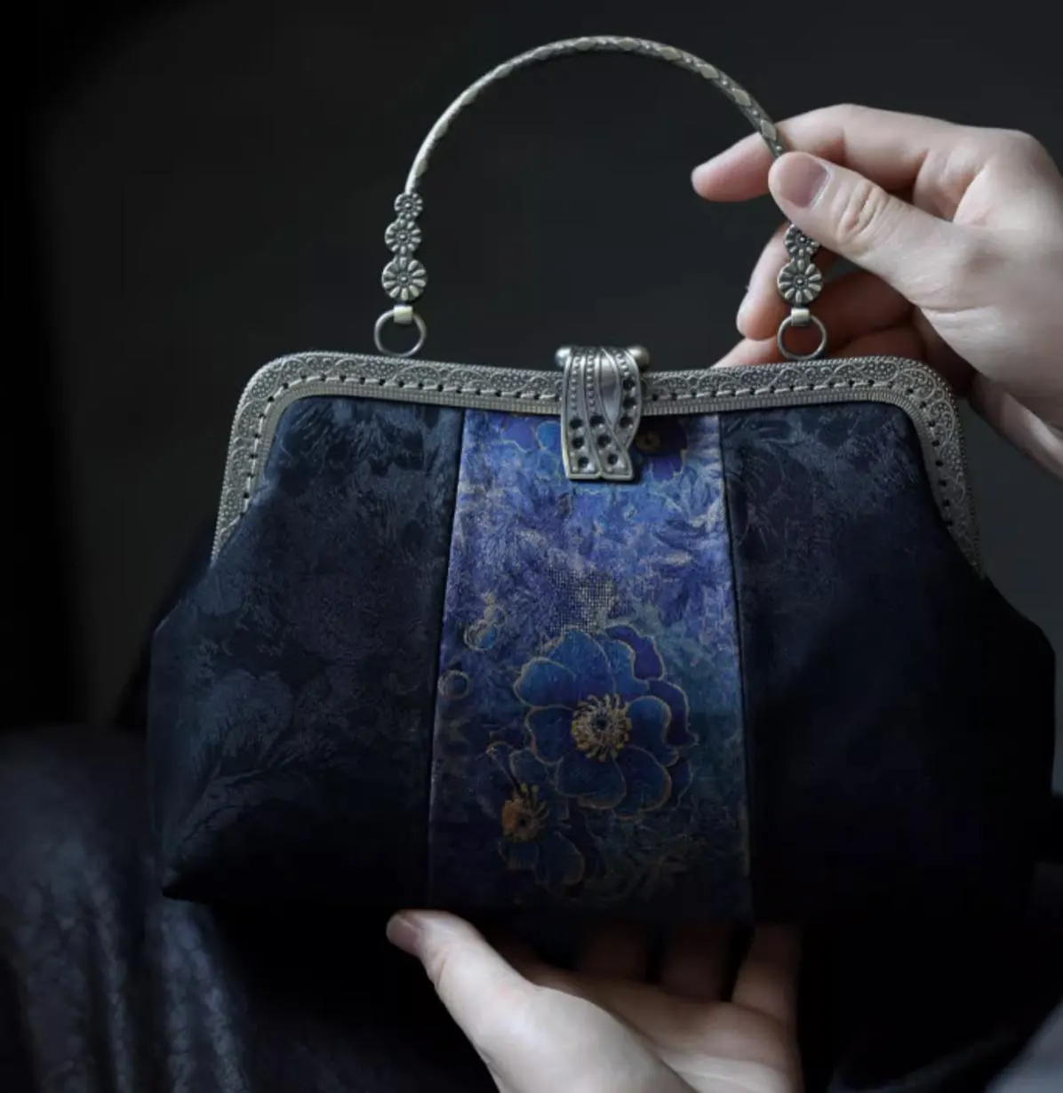 Black jacquard with a central sapphire-blue brocade panel blooming with peonies, finished with an antique silver kiss-lock and a carved floral top handle—elegant, poised, and unmistakably refined.