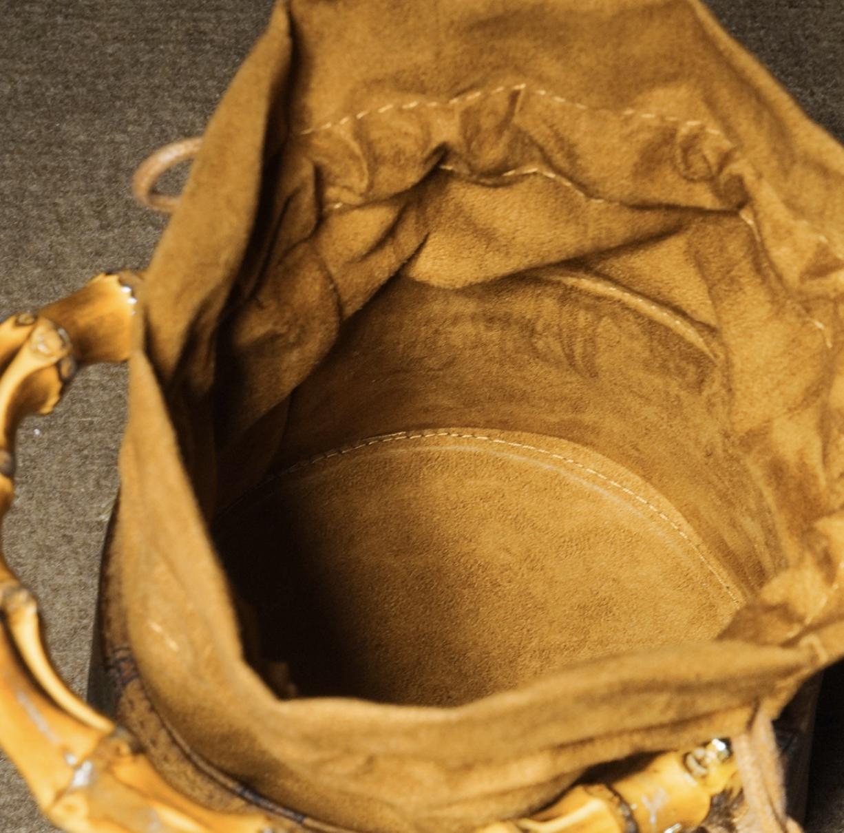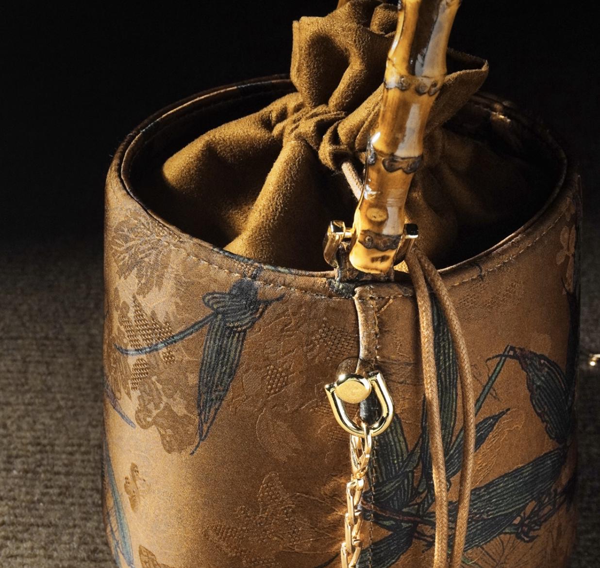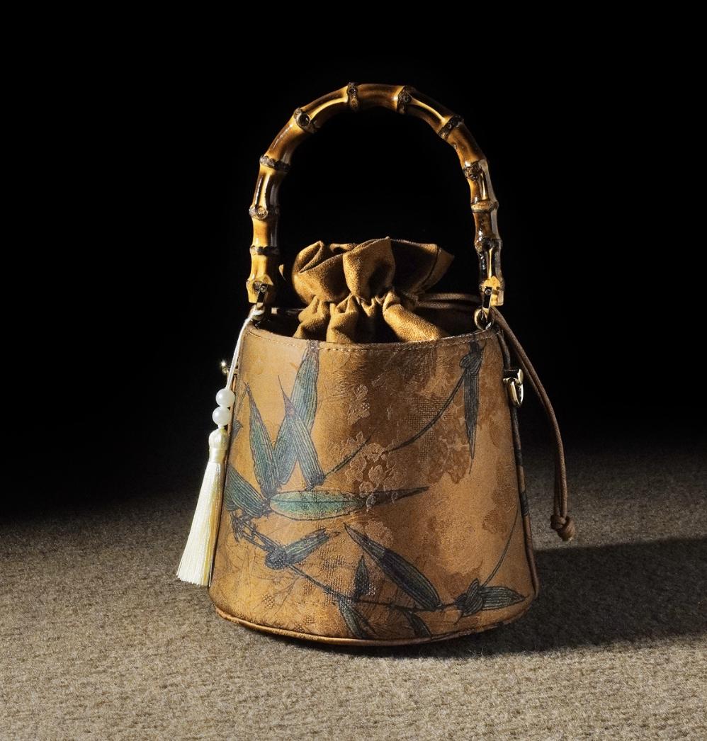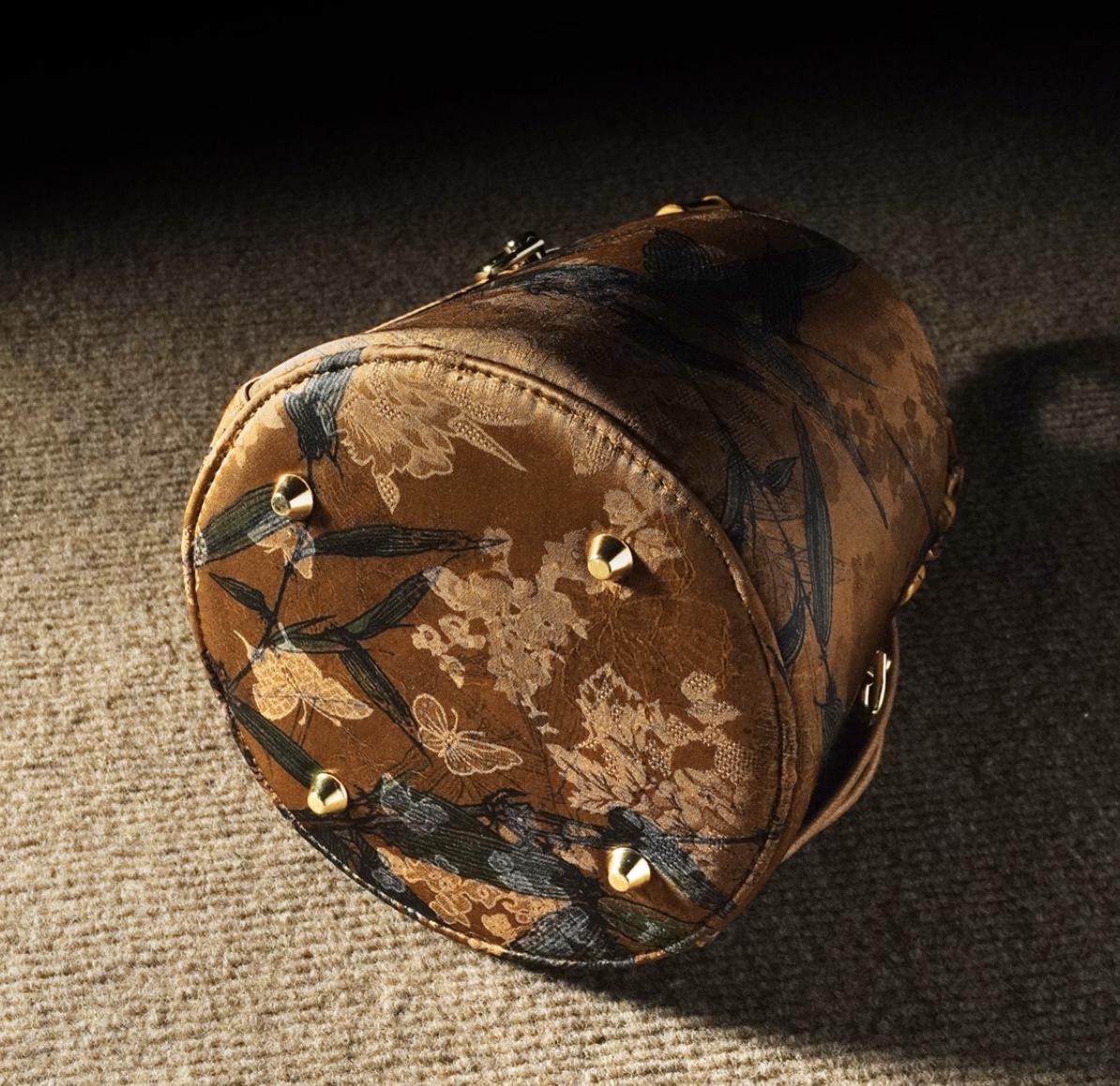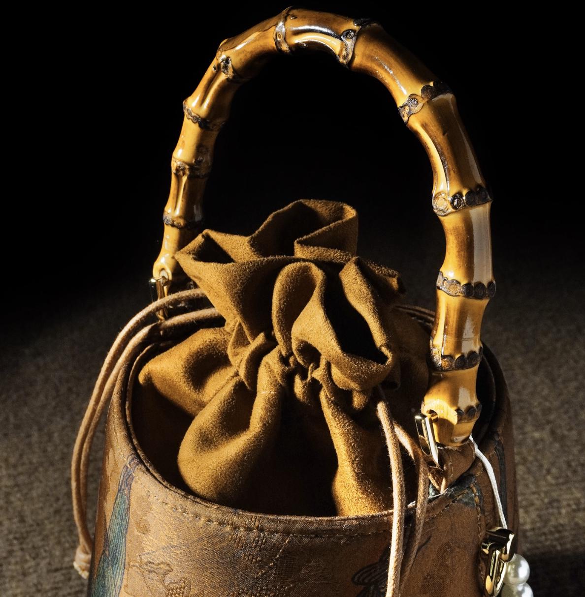 brown brocade bucket / bamboo handle / drawstring pouch / heritage chic / gift-ready accessory