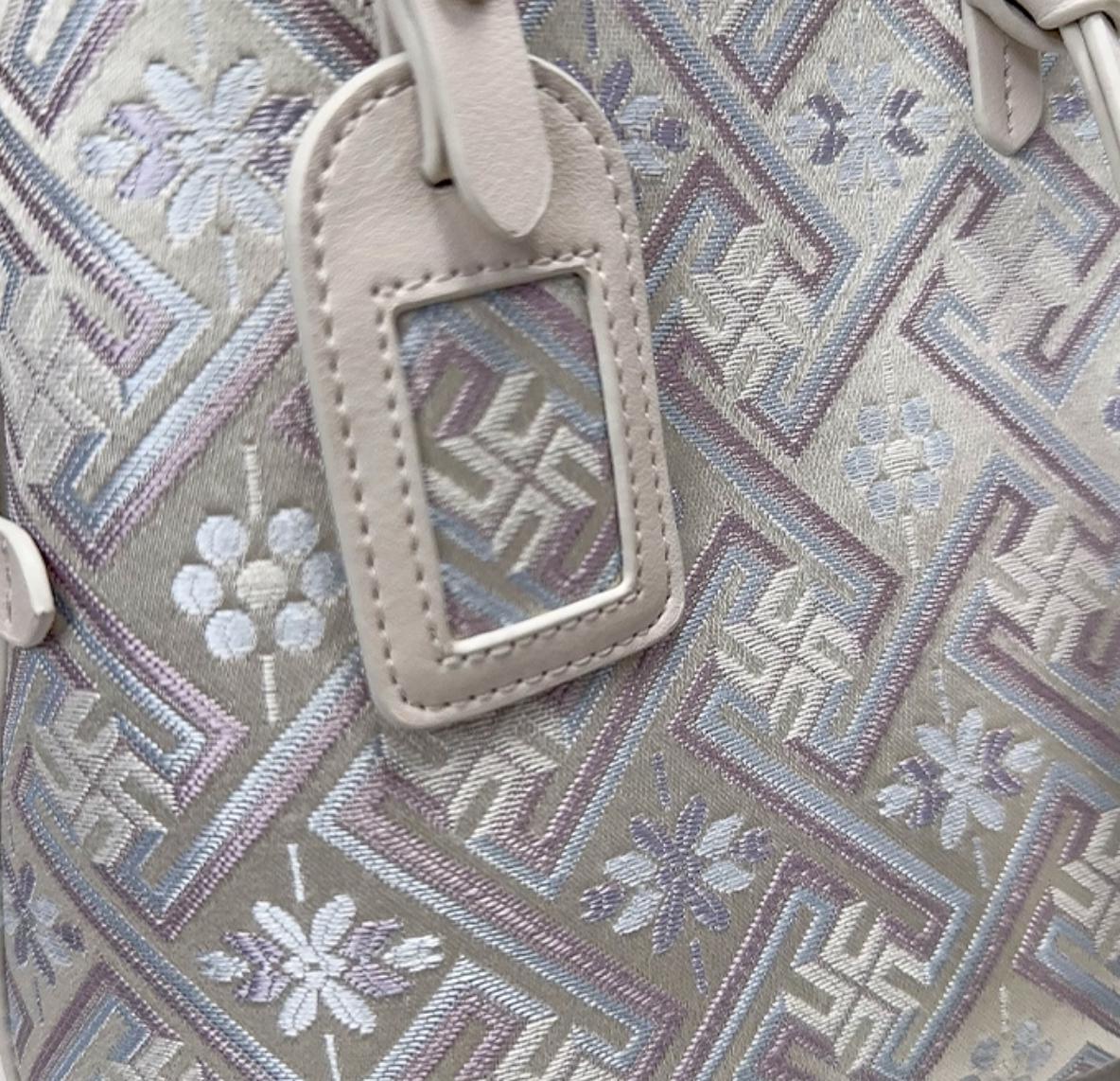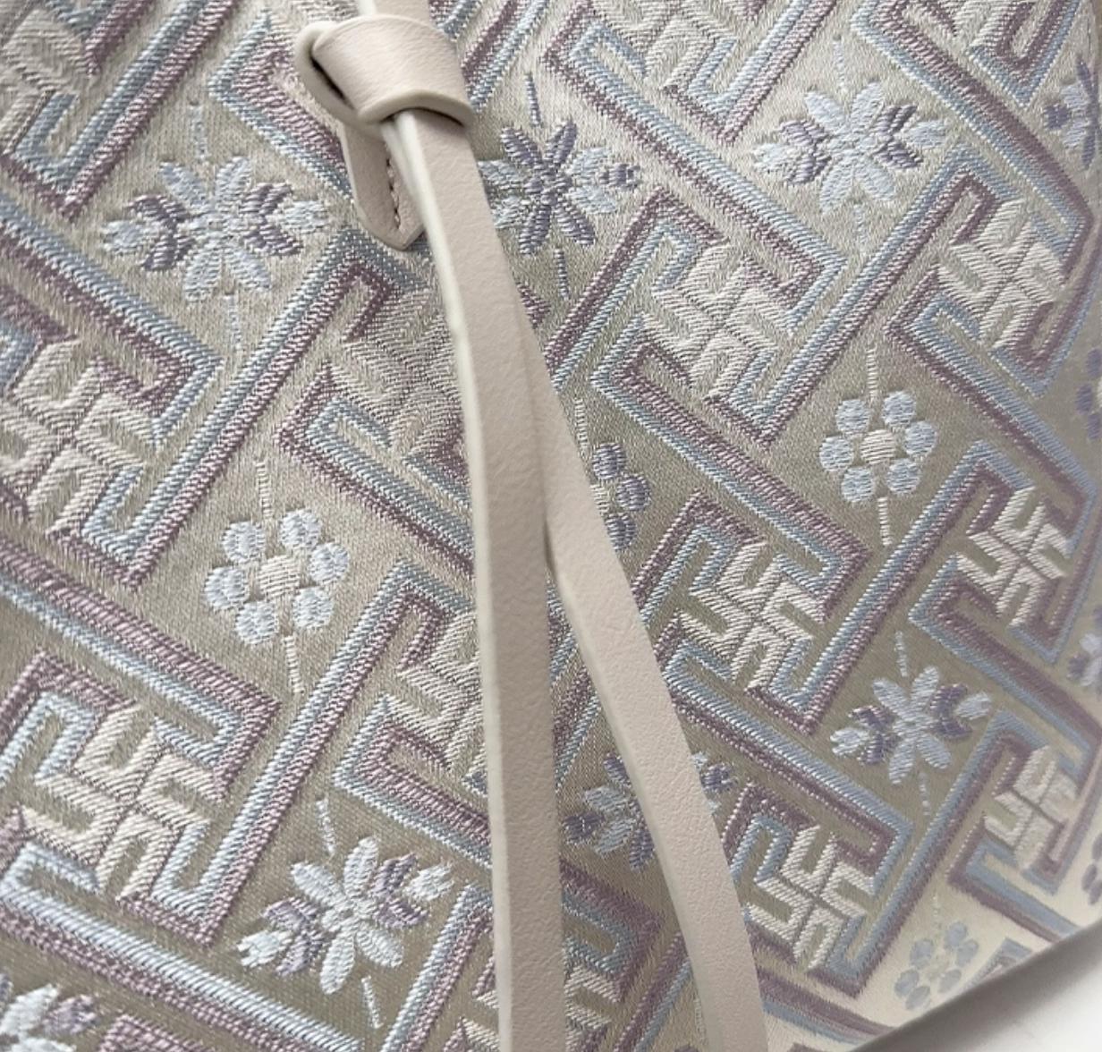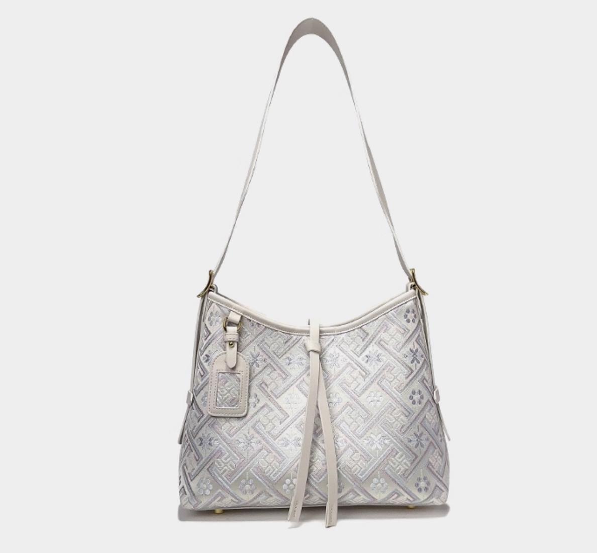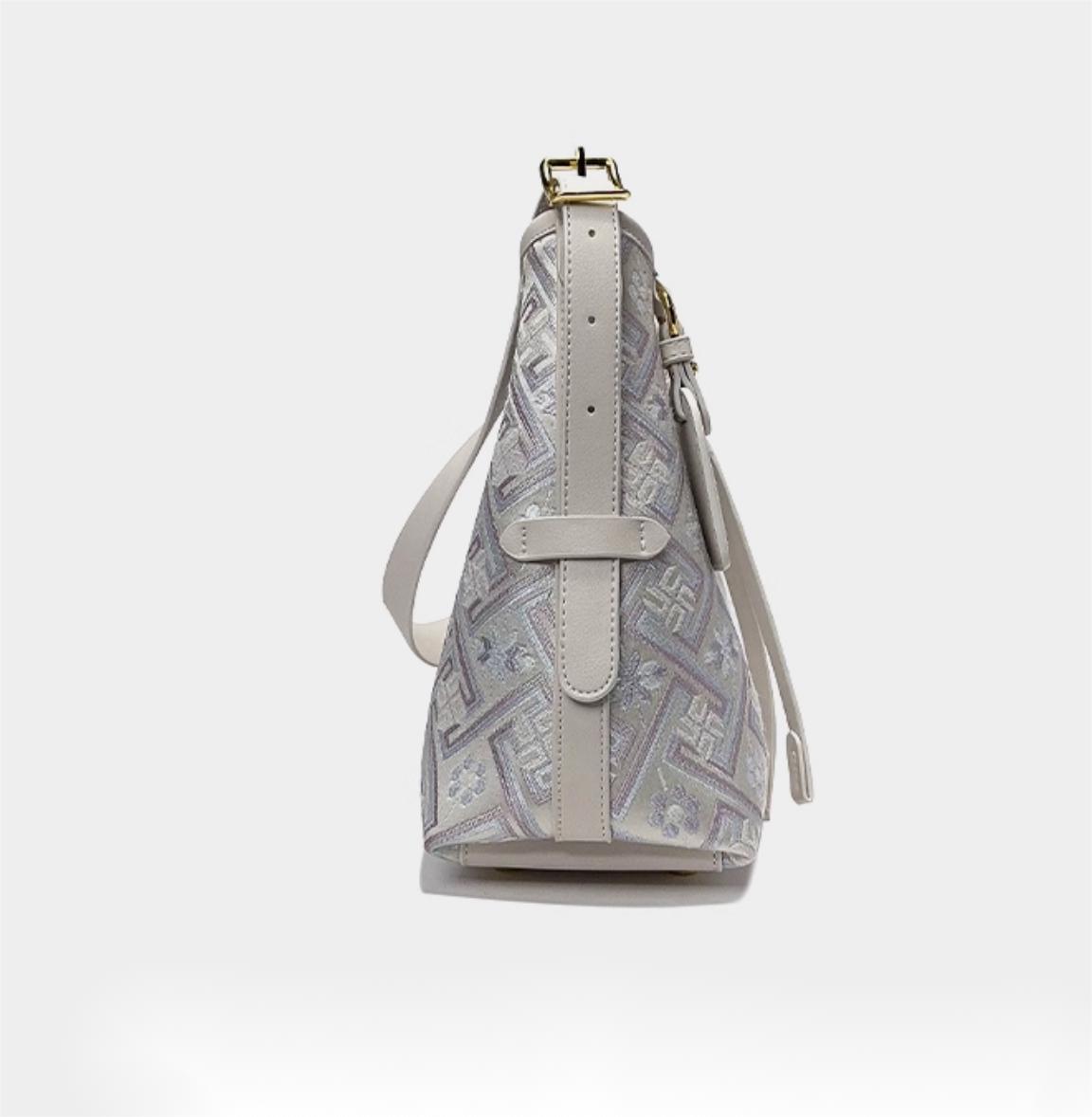 Iridescent silver-white brocade woven with a geometric lattice and tiny flower motifs, framed by smooth cream trim and brushed gold hardware. A wide, sculpted strap hugs the shoulder—quiet luxury for day to night.