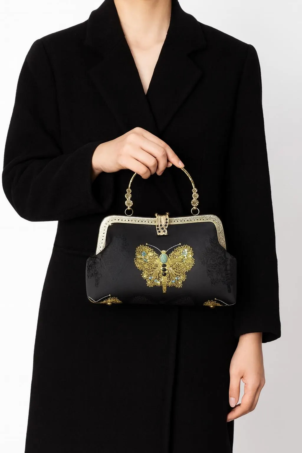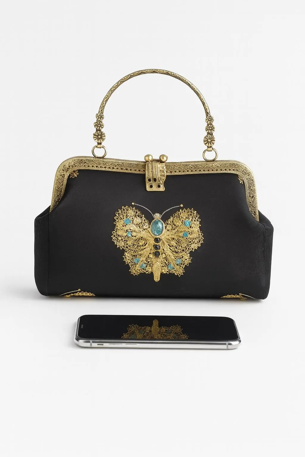 Black satin-jacquard crowned by an engraved antique-gold frame and a floral-etched top handle. At center, a filigree butterfly applique set with turquoise-tone and onyx-tone stones glows like jewelry—dramatic, regal, and photo-ready.