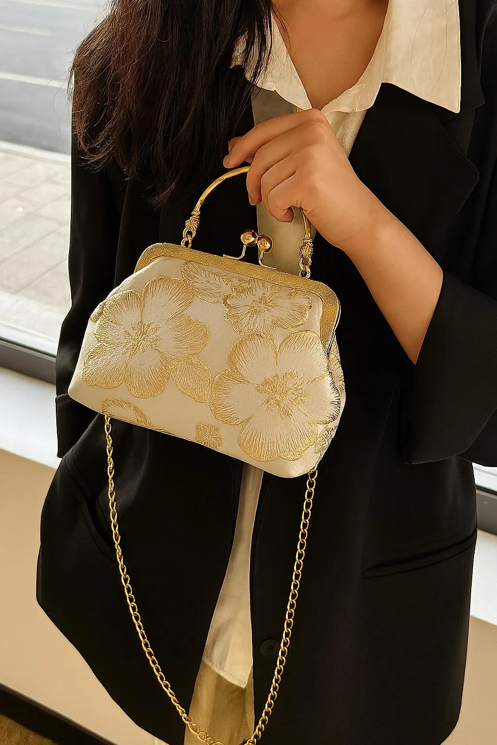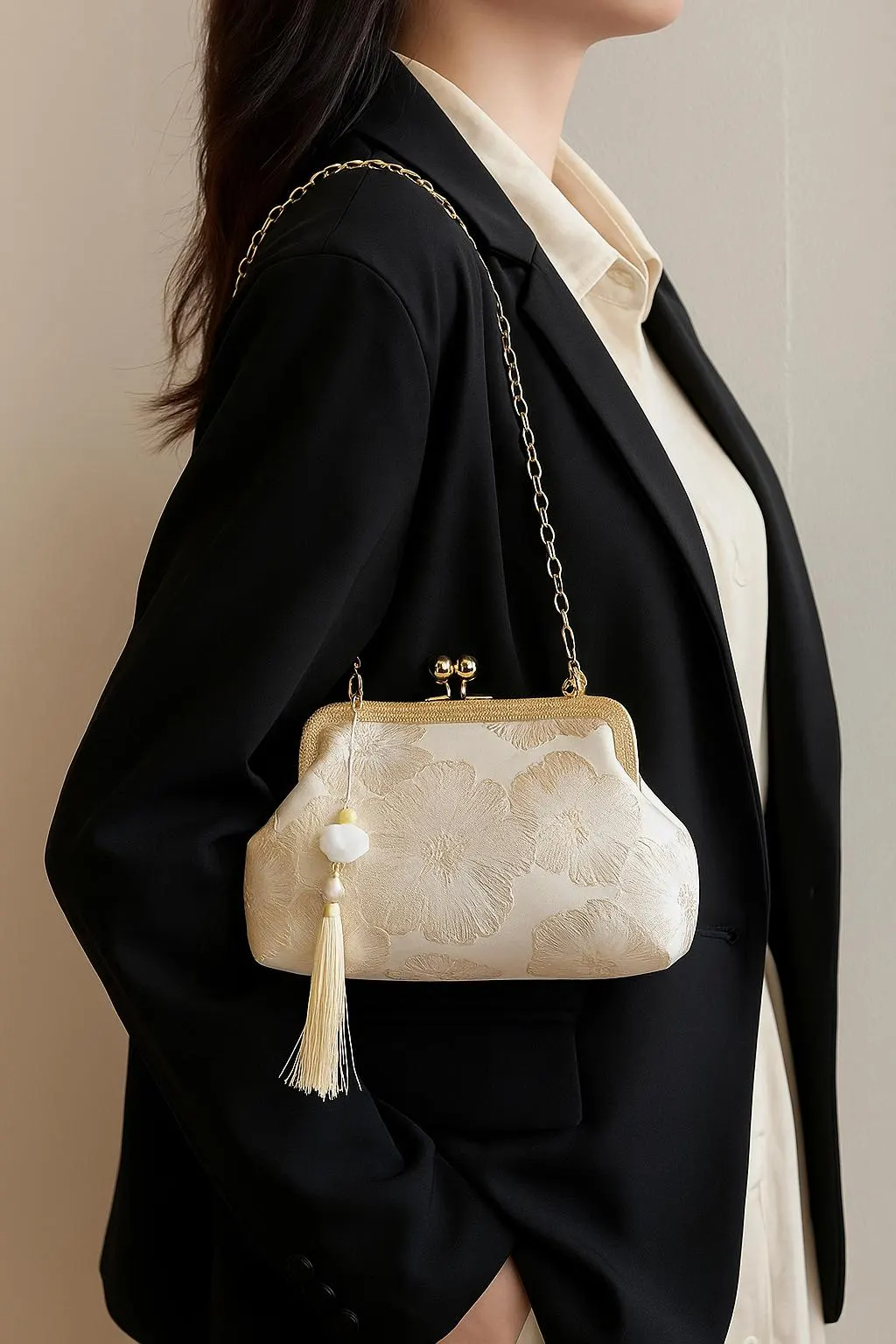 Ivory brocade woven with luminous gold florals, framed by an engraved gold kiss-lock and an arched top handle. A detachable tassel charm with bead accents and a slim chain strap complete the jewelry-like look—elegant and wedding-ready.