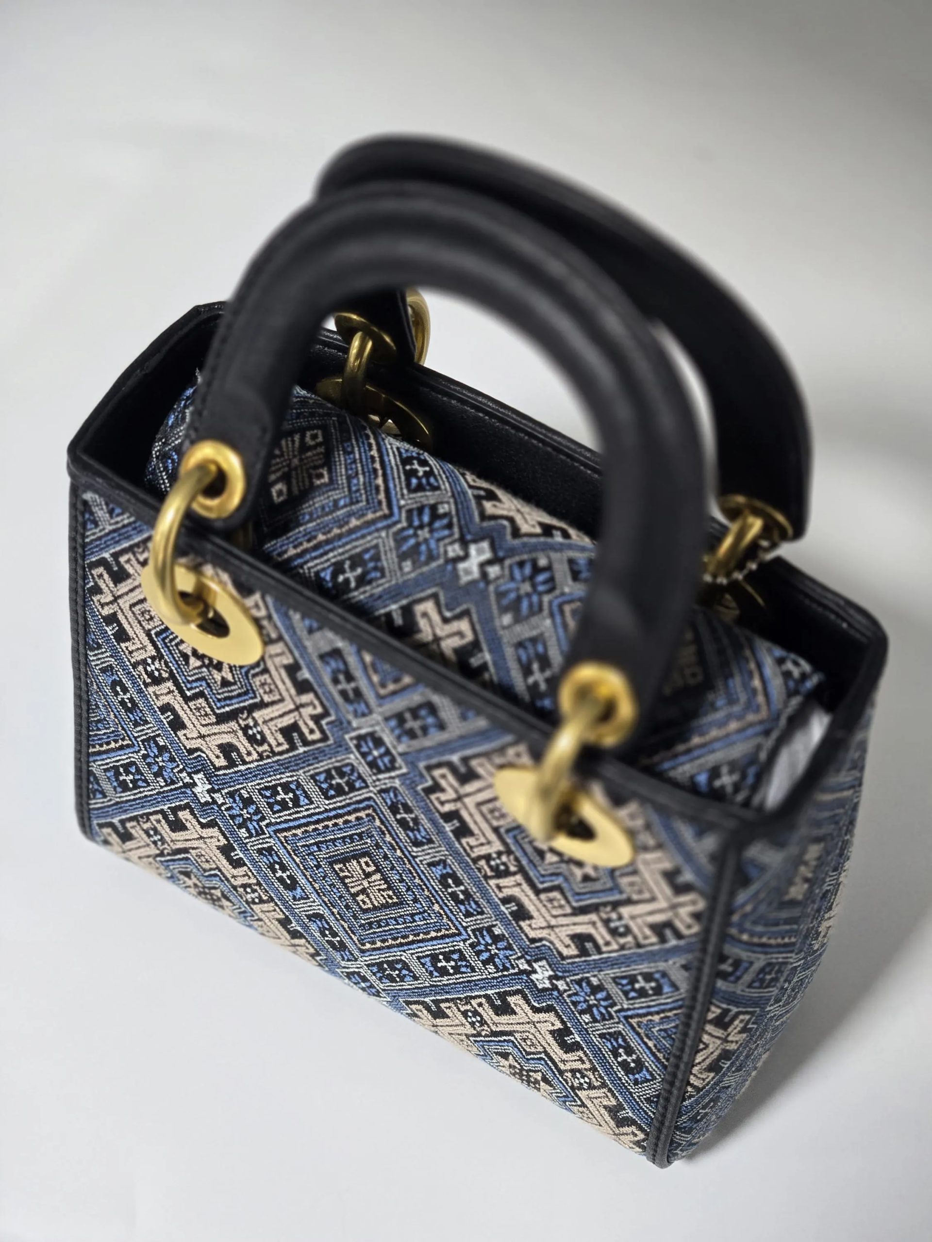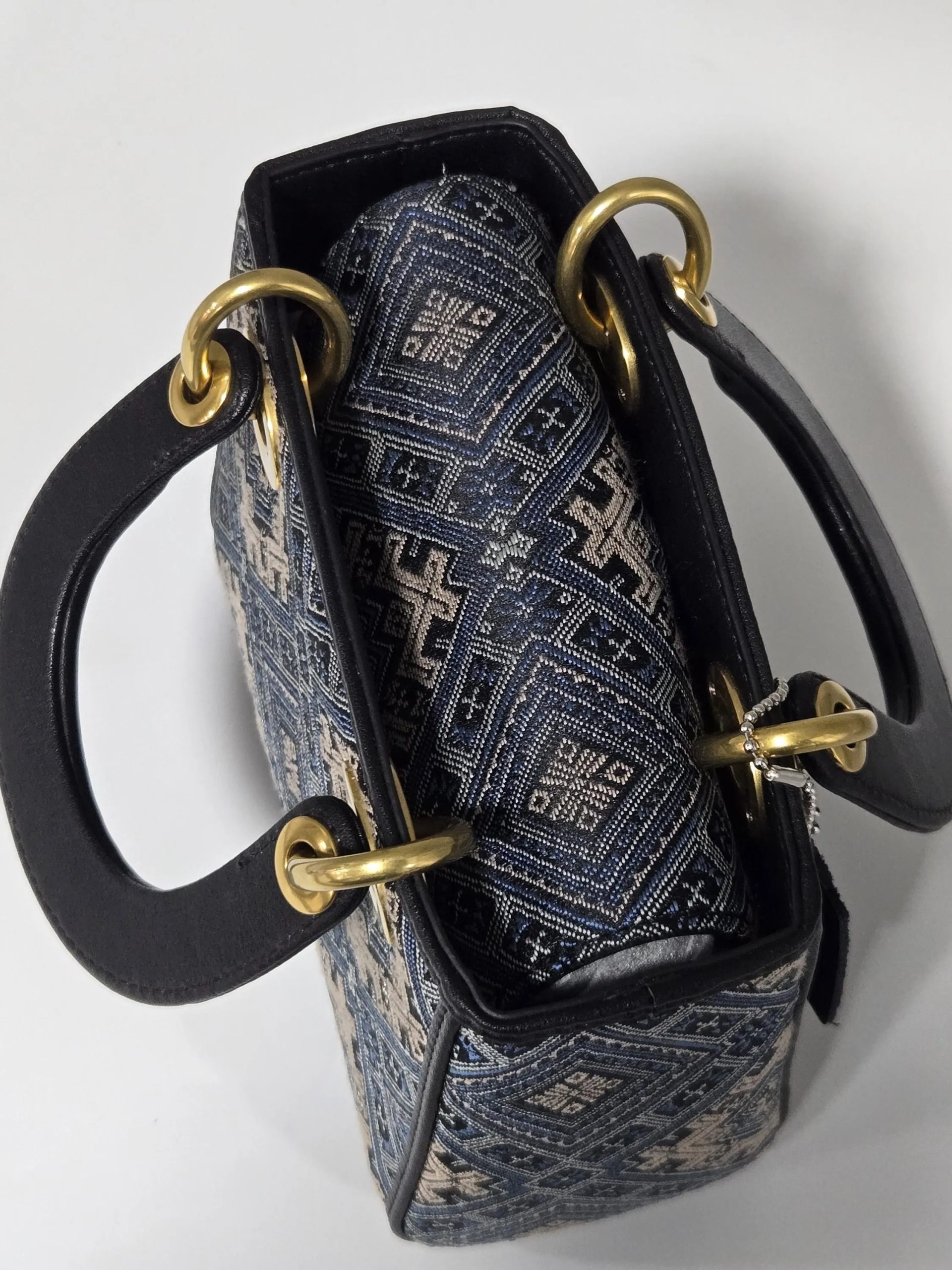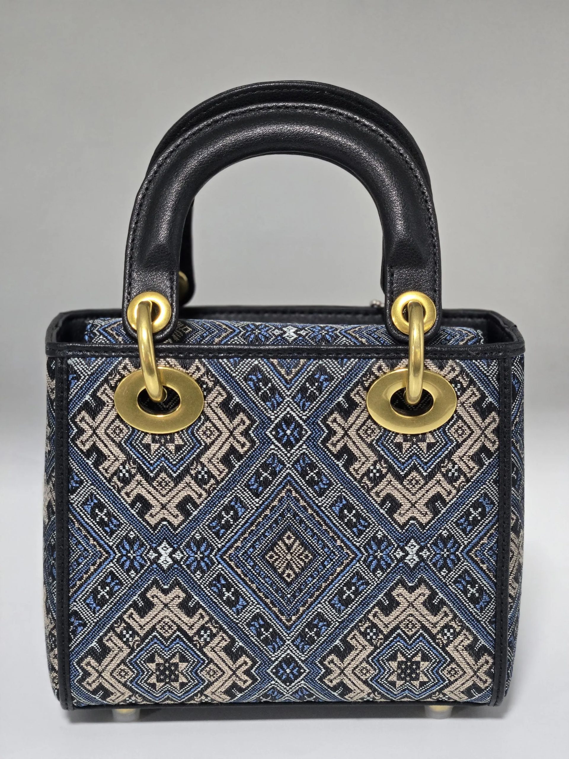Geometric jacquard in deep indigo, sand, and black forms a striking lattice pattern, framed by smooth black trim. Chunky matte-gold grommets and rings anchor the padded rolled handles—compact, architectural, and luxe..