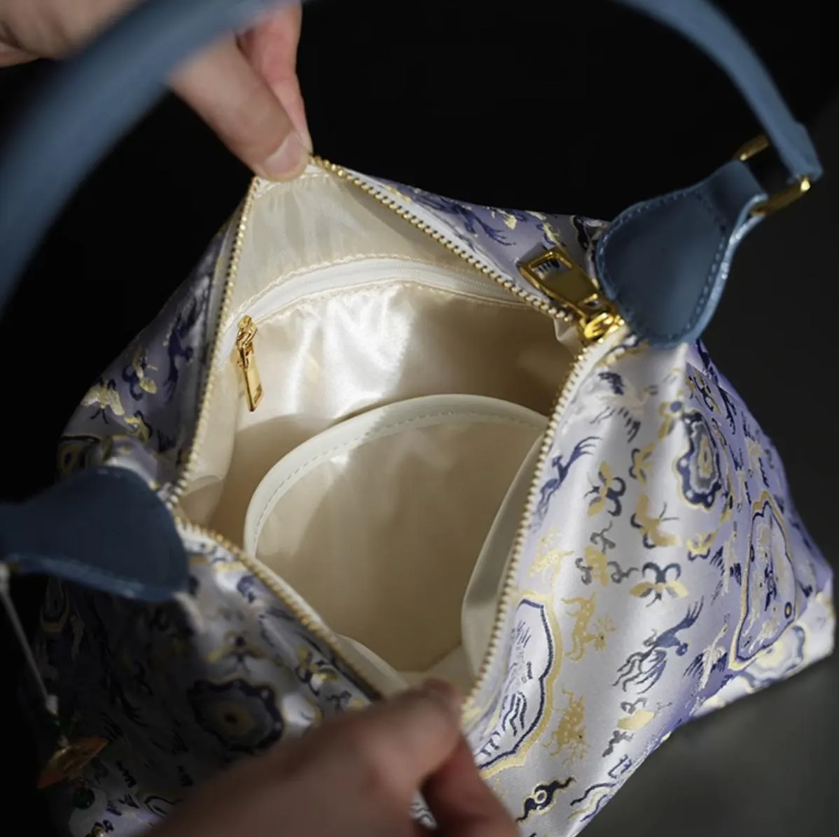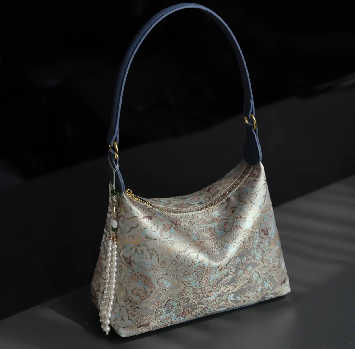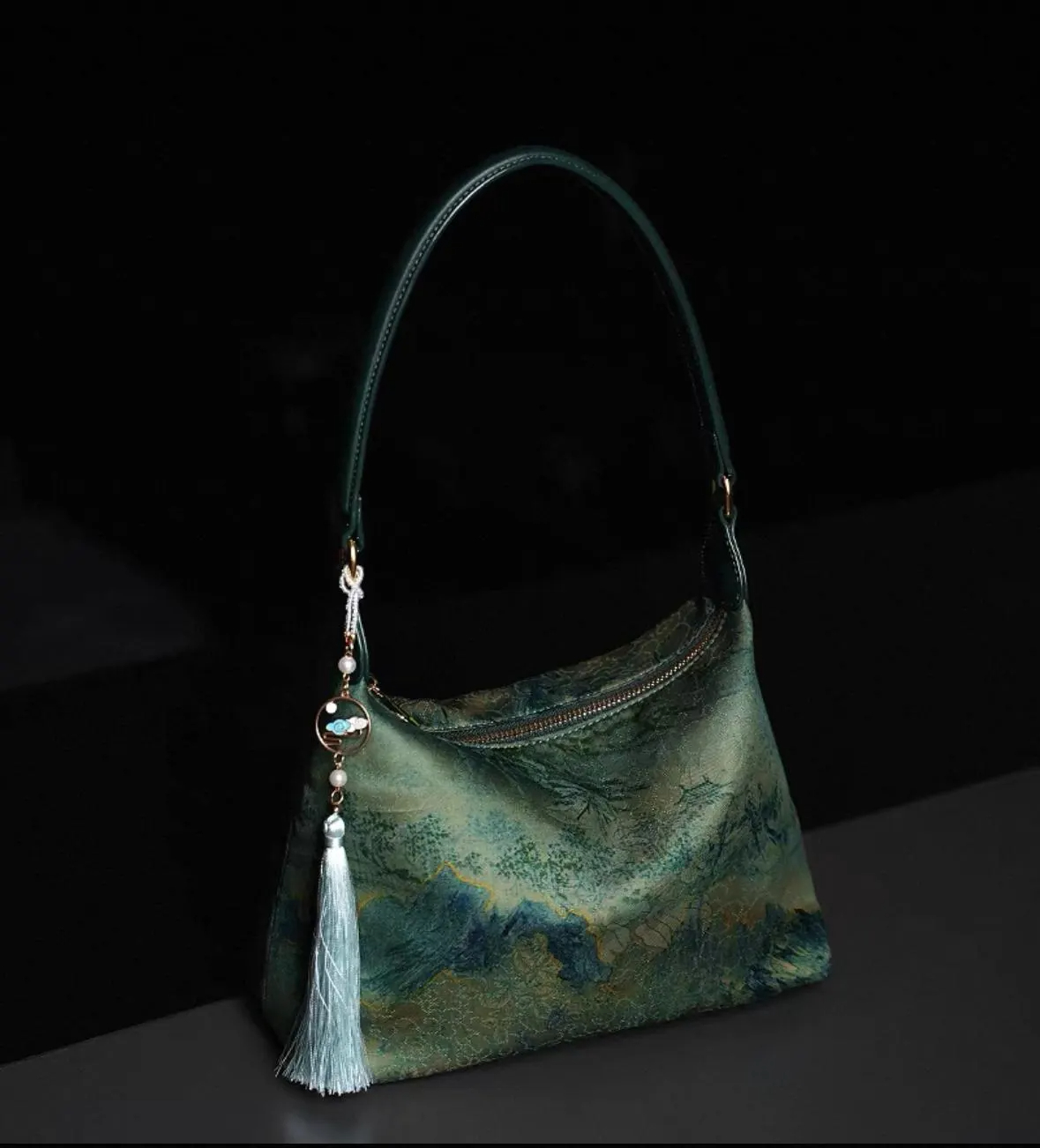 Deep jade-green satin with an ink-wash mountain print, framed by matching leather-look trim. A zipper curves along the top line, while a detachable tassel charm with bead accents adds graceful movement—quietly dramatic and photo-ready.