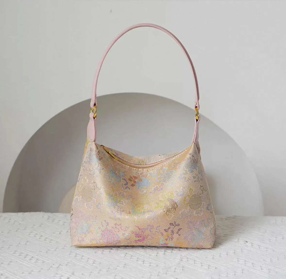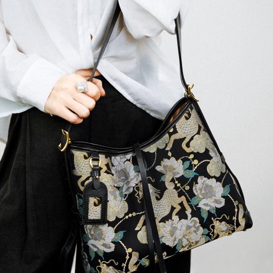 Avoid prolonged sun or moisture. Spot-clean the textile with a soft dry cloth; wipe hardware gently after use. Remove the tassel before storage and keep the bag in a dust bag to preserve its shape.