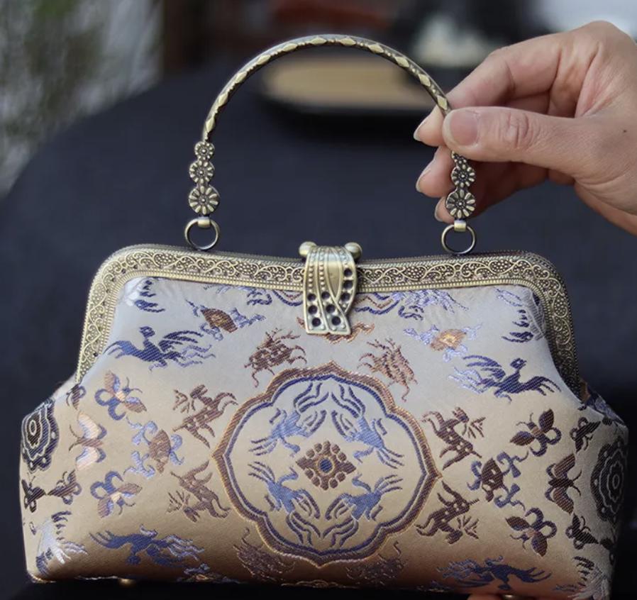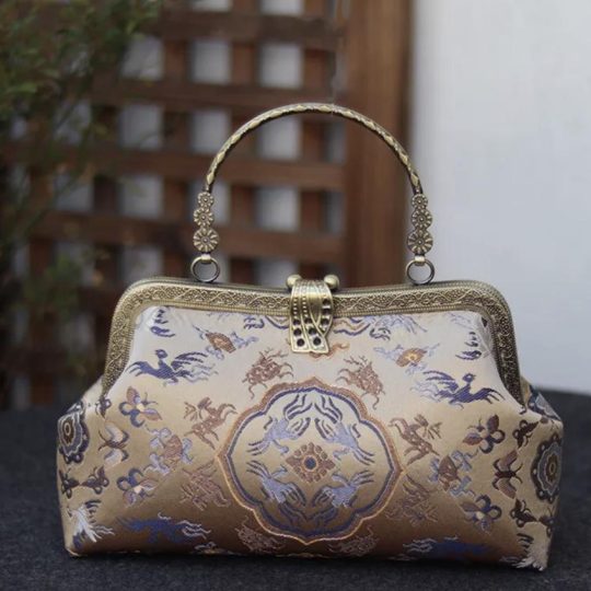 Architectural frame & kiss-lock: Polished gold top handle with a crisp, secure click.