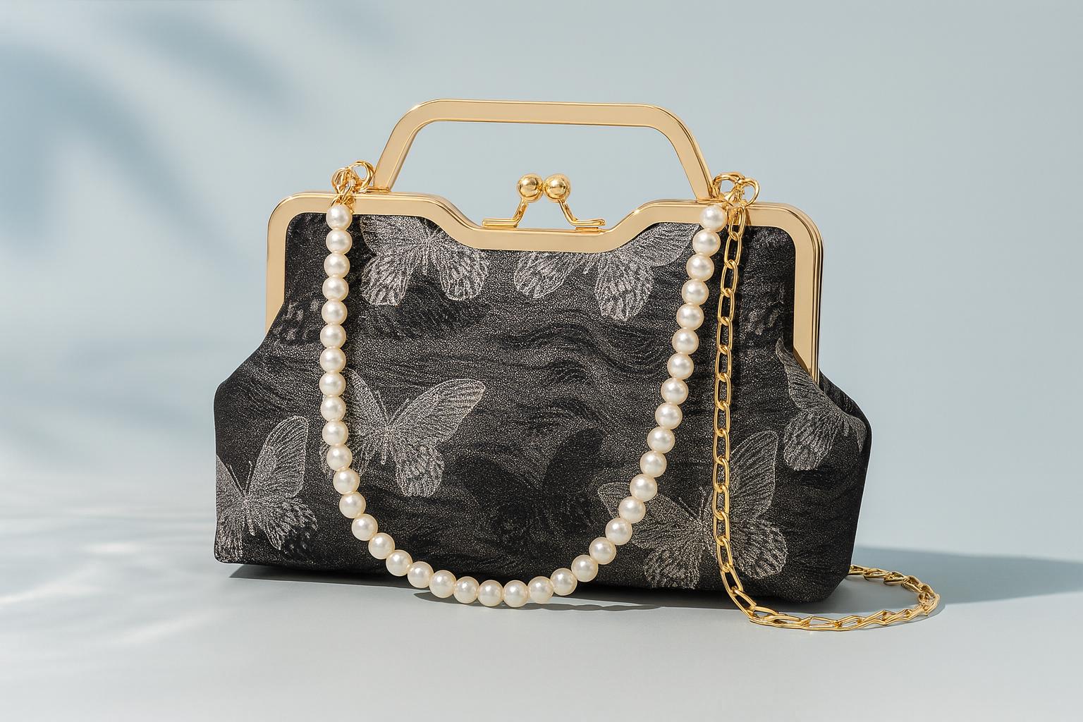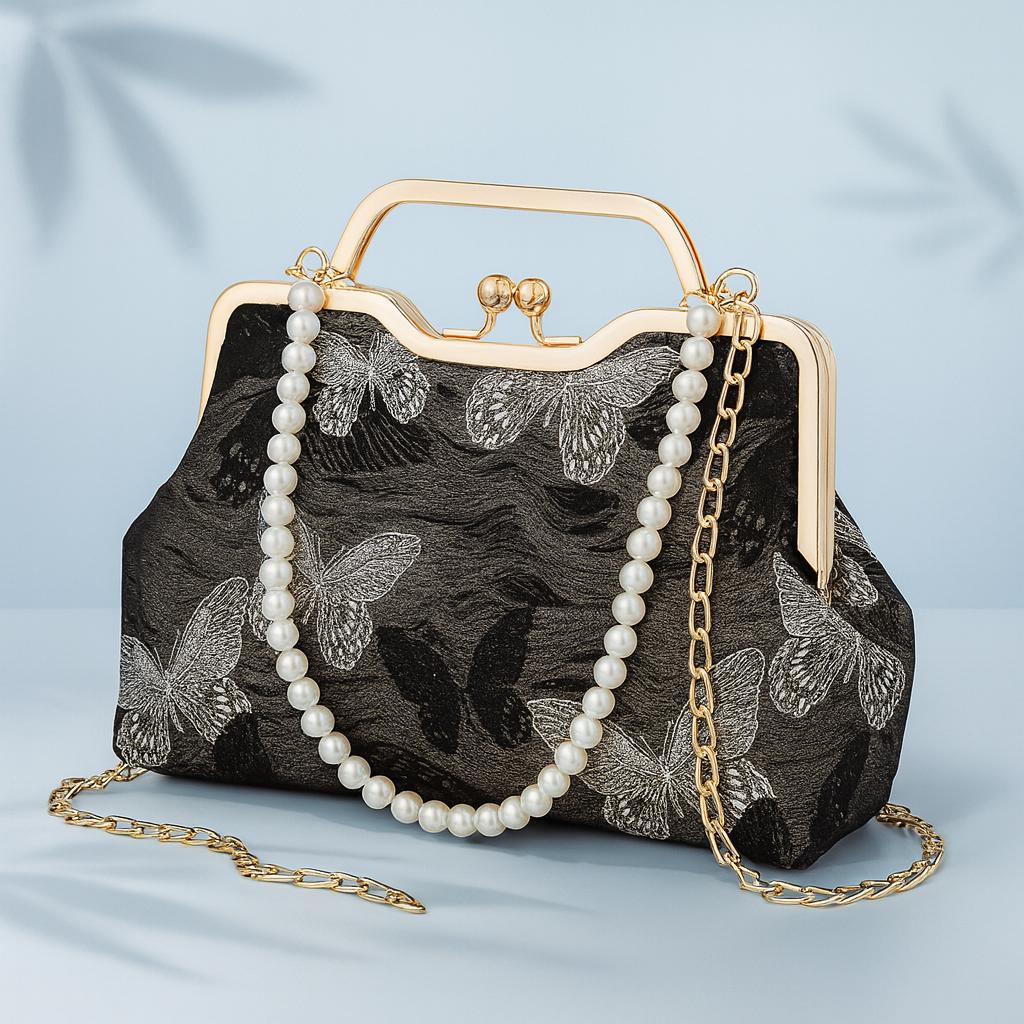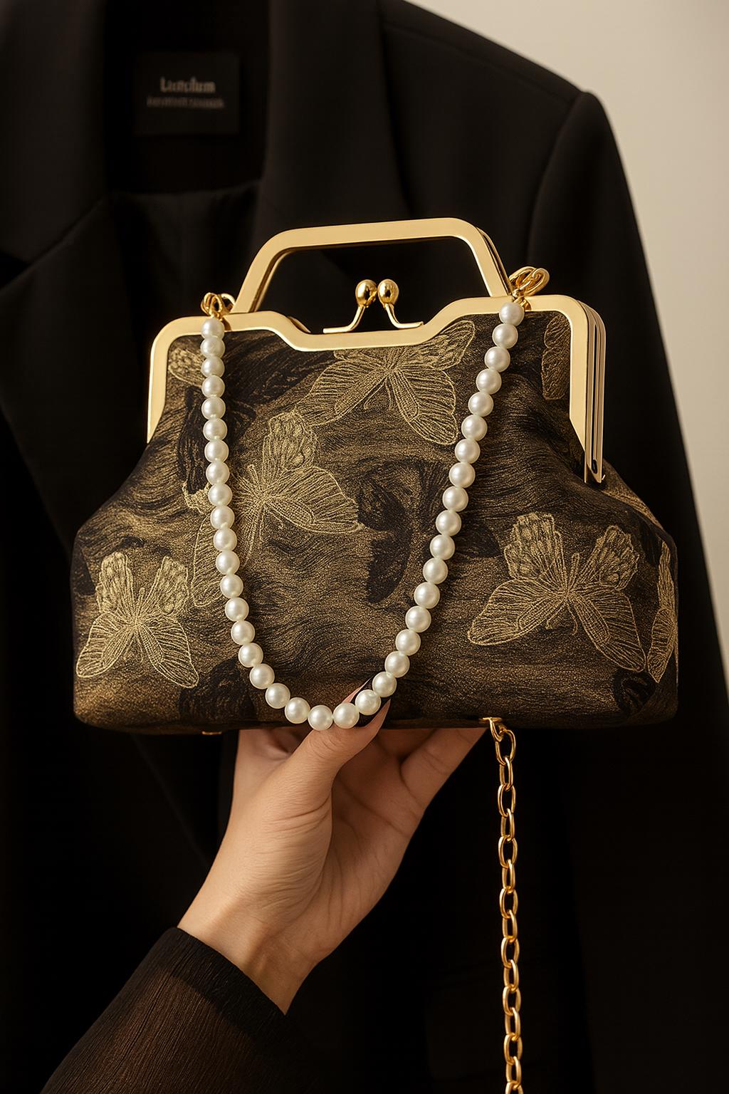 Black jacquard with drifting, tone-on-tone butterflies, outlined by a sculptural gold metal frame. A detachable pearl handle and a gold chain strap take it from cocktail hour to gala night in seconds.