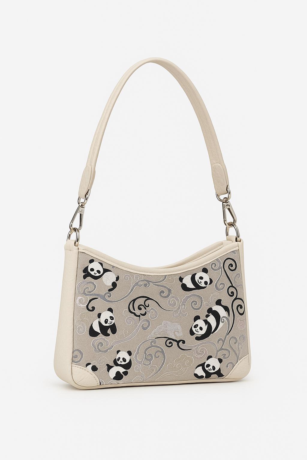 Playful yet polished: a cream-toned shoulder bag embroidered with lively pandas and swirling cloud motifs, outlined by smooth leather-look trim—sweet charm meets everyday ease.