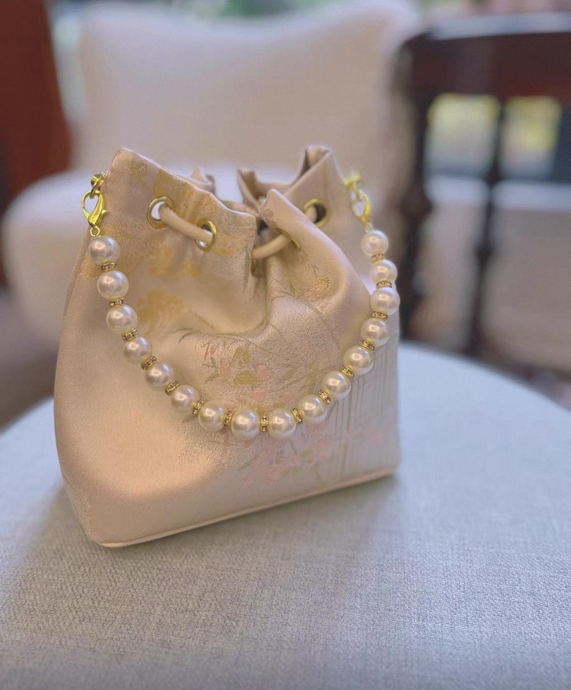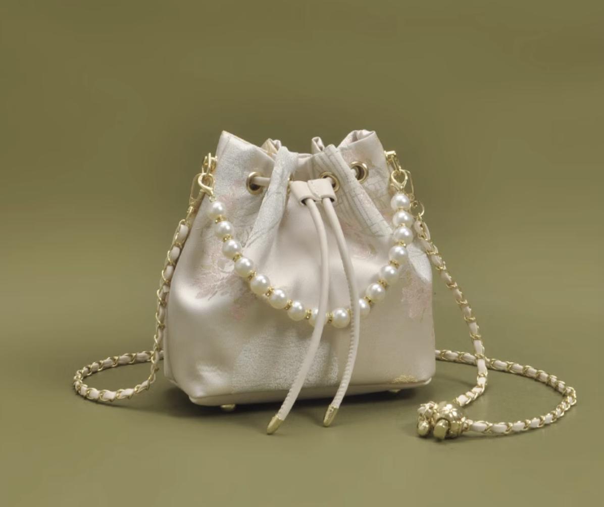pearl-handle bucket bag / brocade drawstring / wedding & banquet / crossbody option / gift-ready accessory