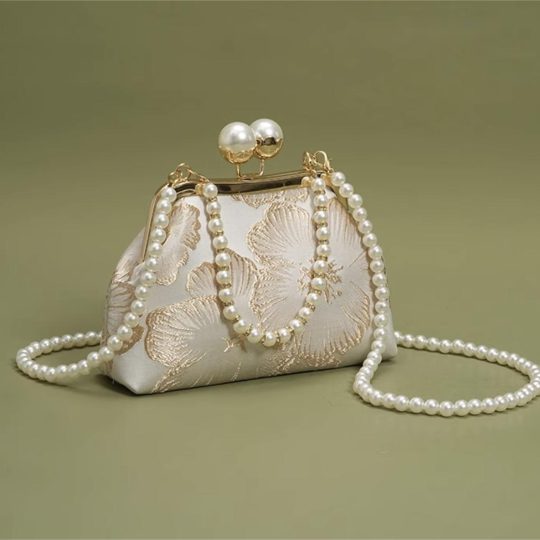 Soft champagne-ivory brocade with a gentle pearly sheen; the floral pattern emerges in the light. Gold-tone hardware pairs with a graceful arc of glossy faux pearls—sweet, elegant, and luminous.