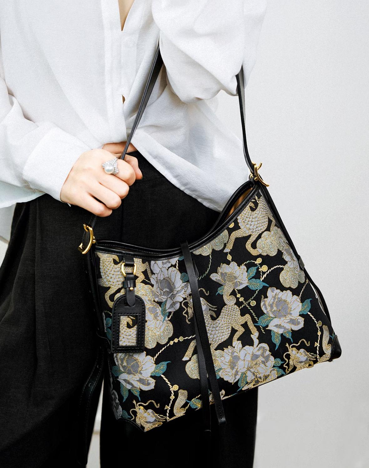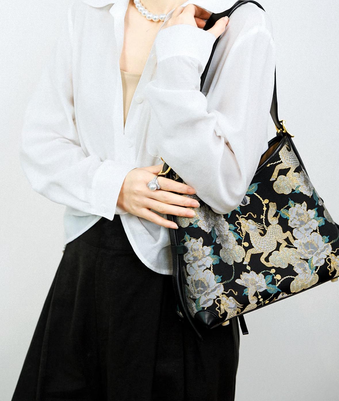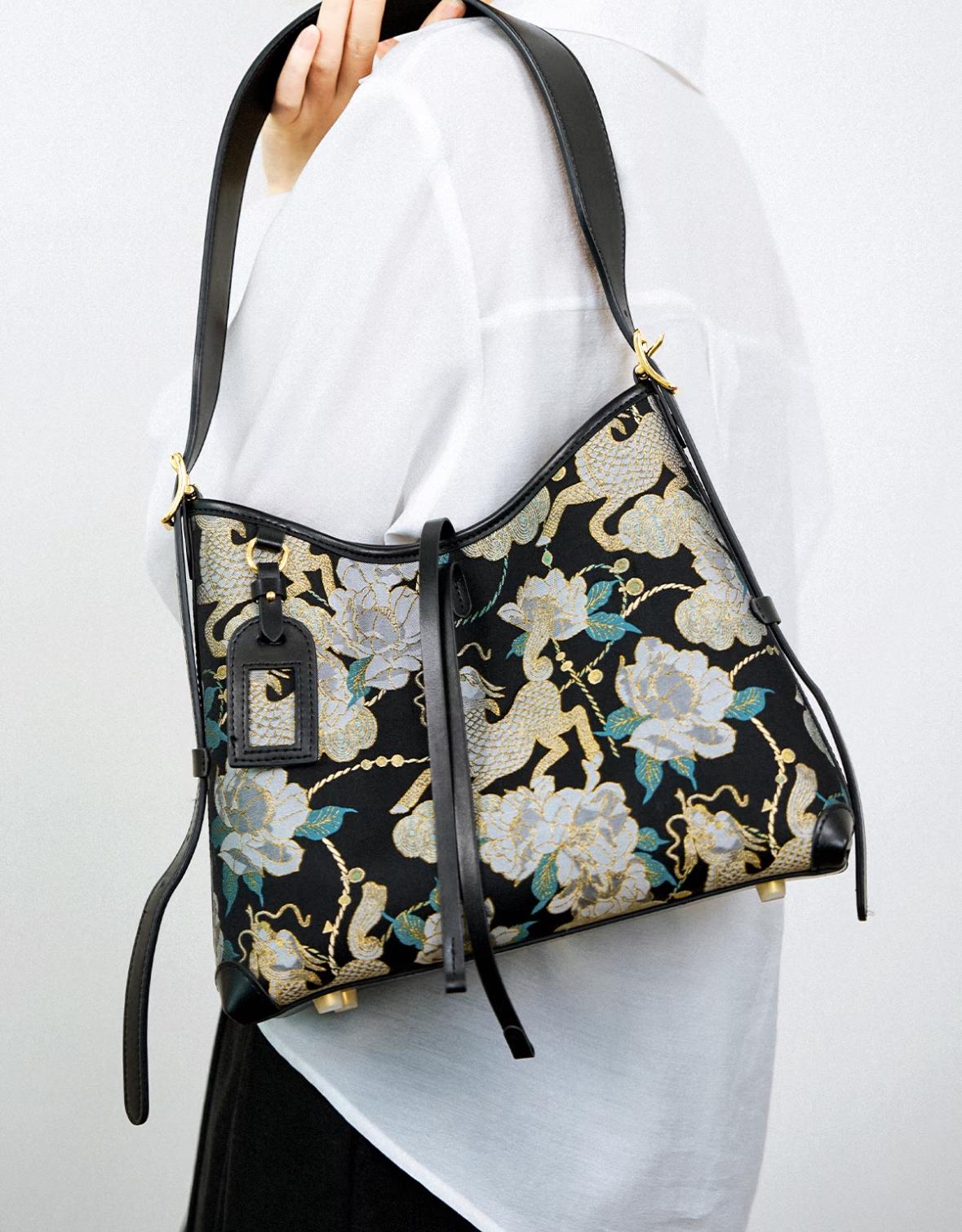 brocade shoulder bag / phoenix & peony / gold-tone hardware / crossbody option / heritage chic