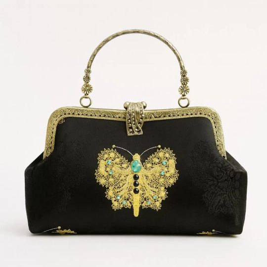 Spot-clean the brocade with a soft dry cloth; avoid soaking and prolonged sun. Wipe hardware after use and store in a dust bag with the zipper closed to maintain shape.