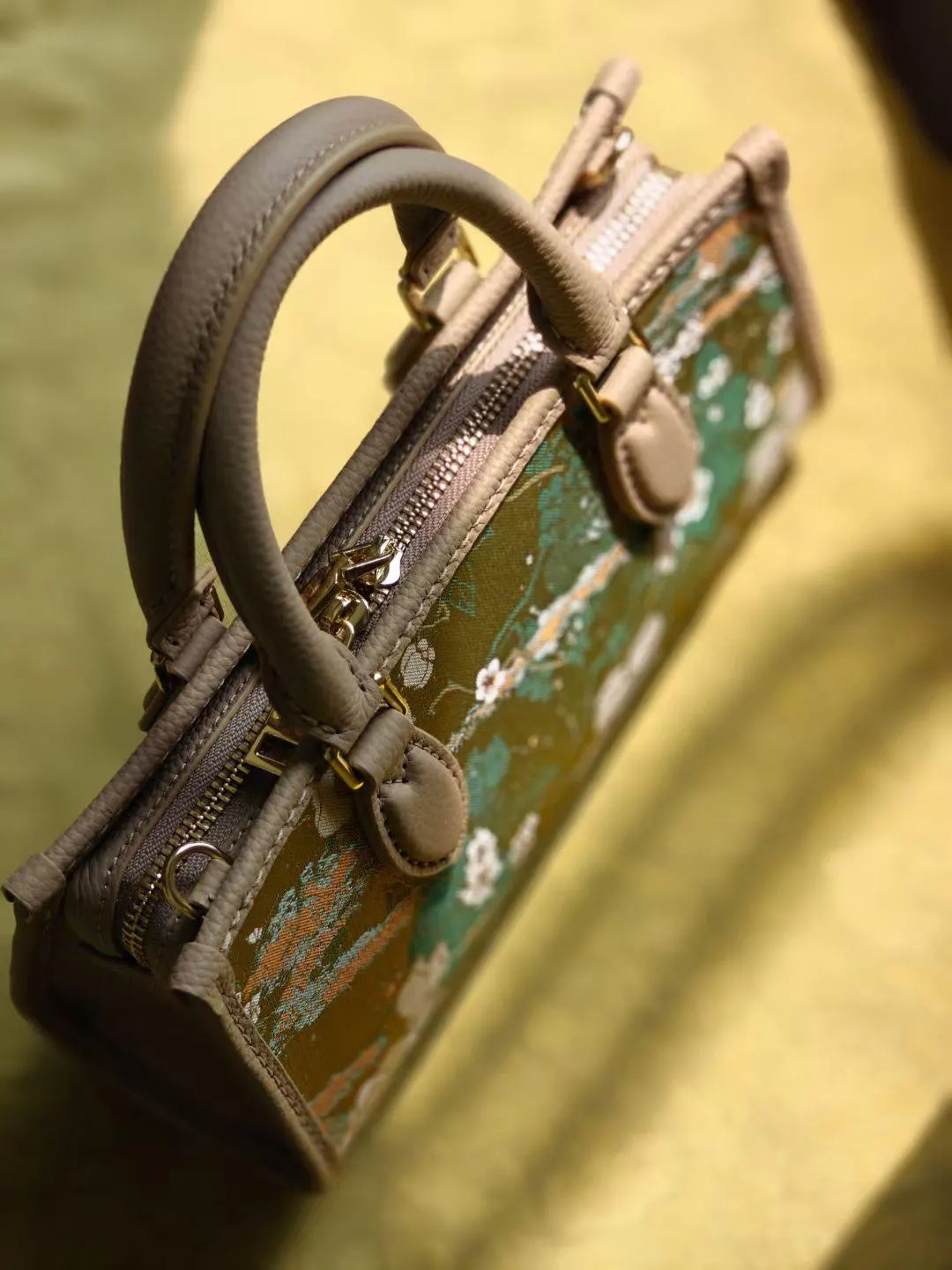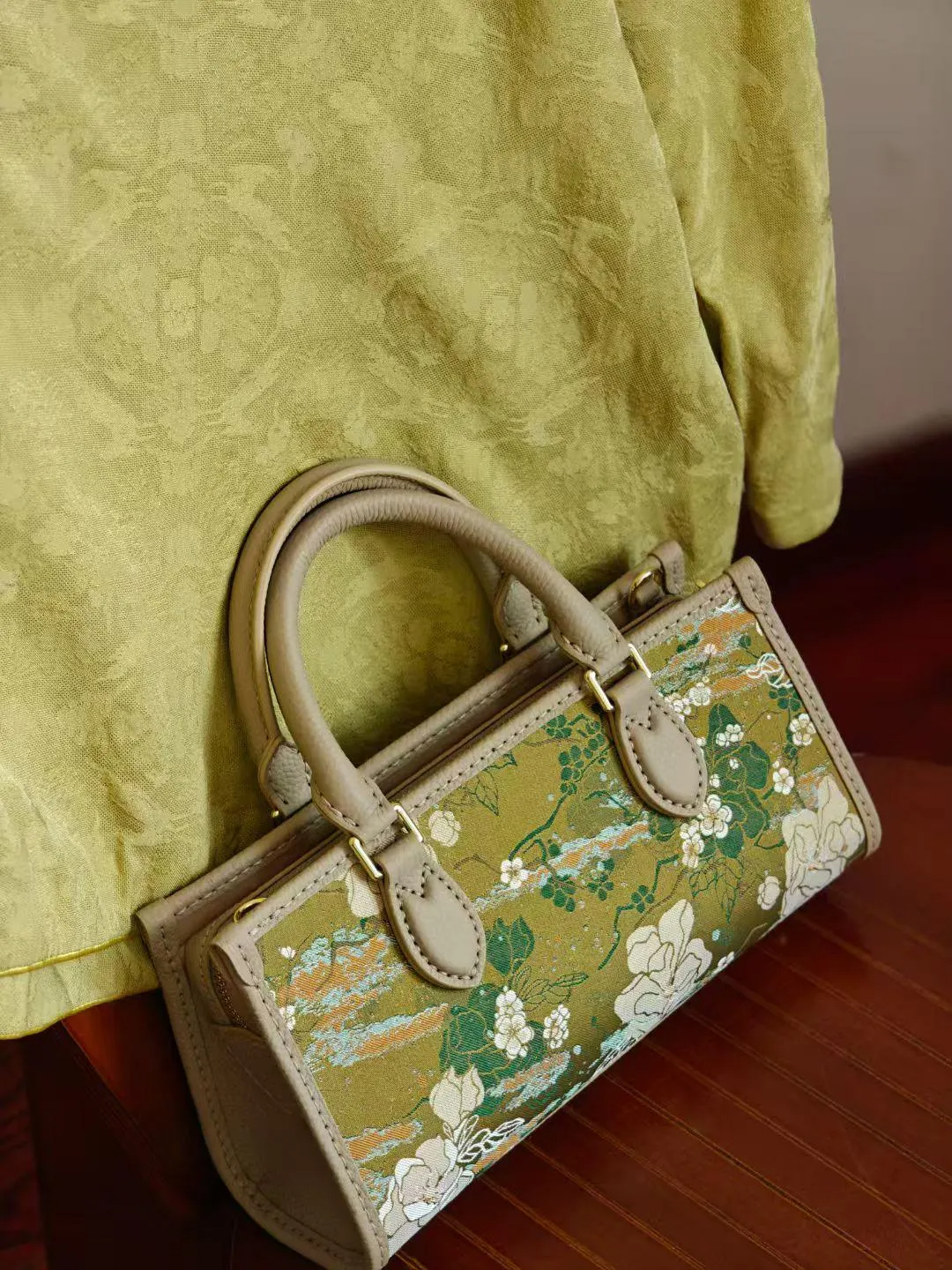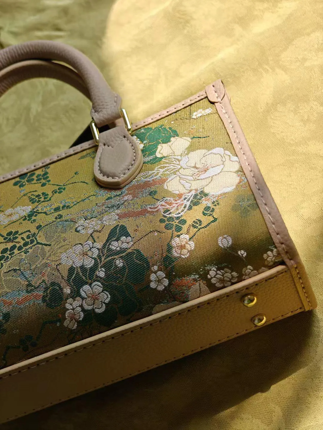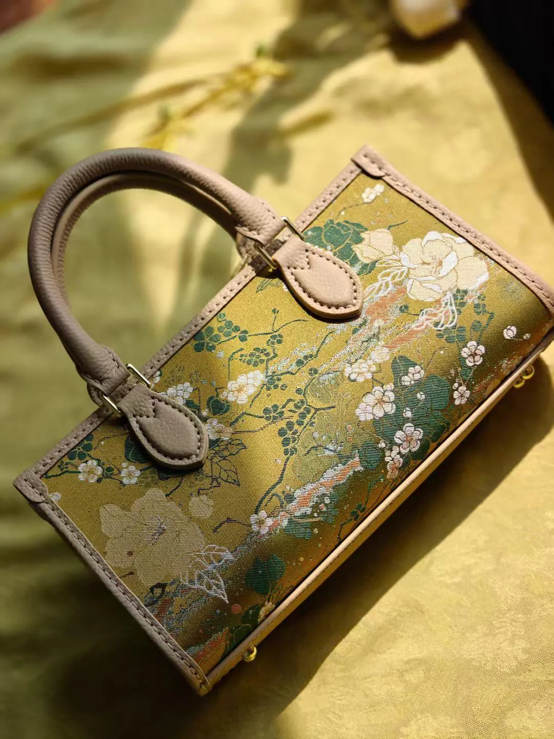 Sunlit olive-gold brocade scattered with white blossoms and soft green vines, framed by smooth beige trim and polished gold hardware. A compact boxy silhouette that looks refined in hand and elegant on the table.