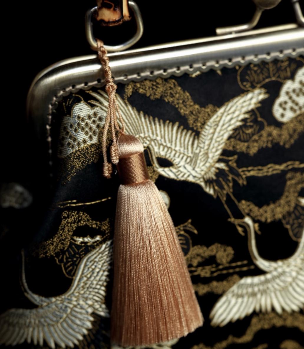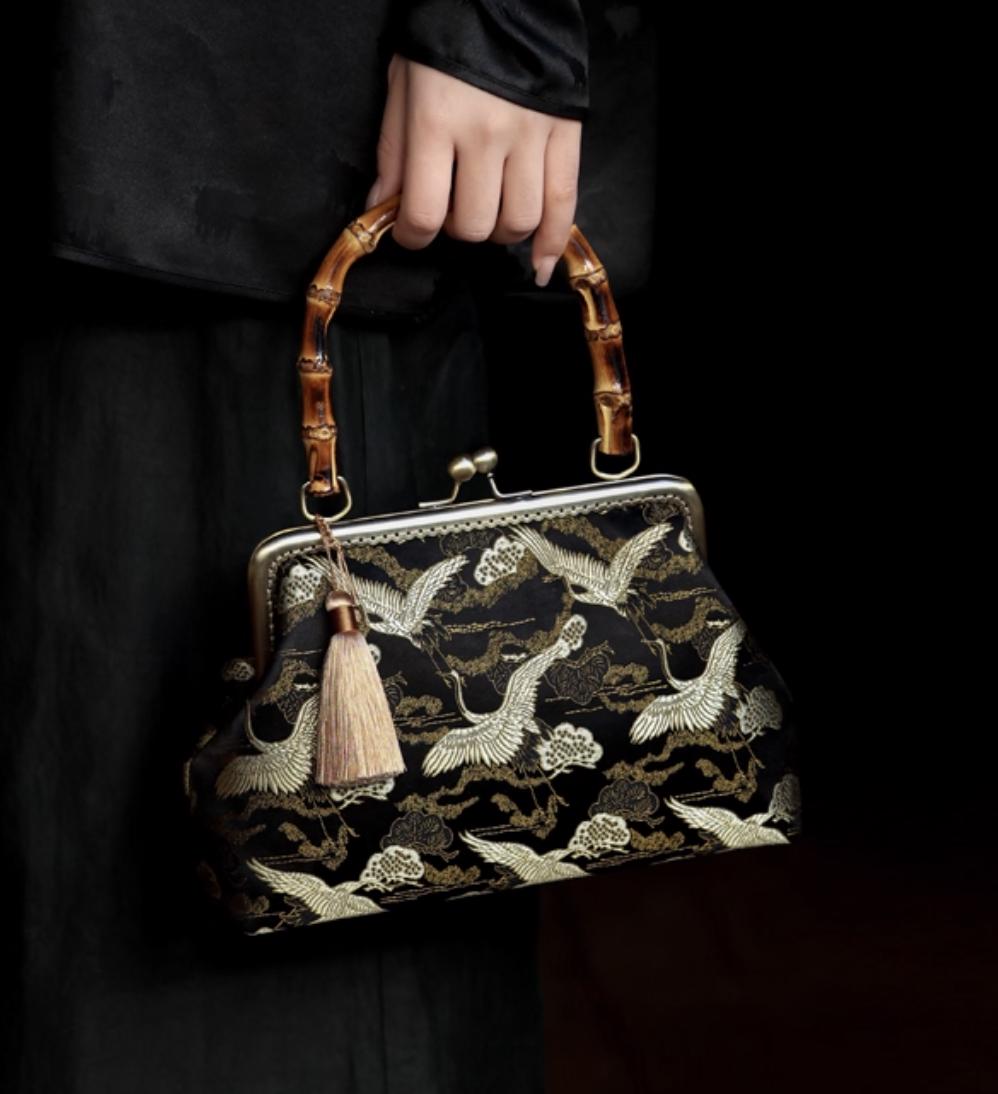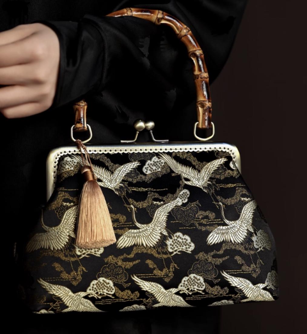 Black brocade woven with soaring cranes and cloud motifs, crowned by an antique brass kiss-lock and a polished bamboo top handle. A soft tassel charm adds ceremonial movement—elegant, timeless, and photo-ready.