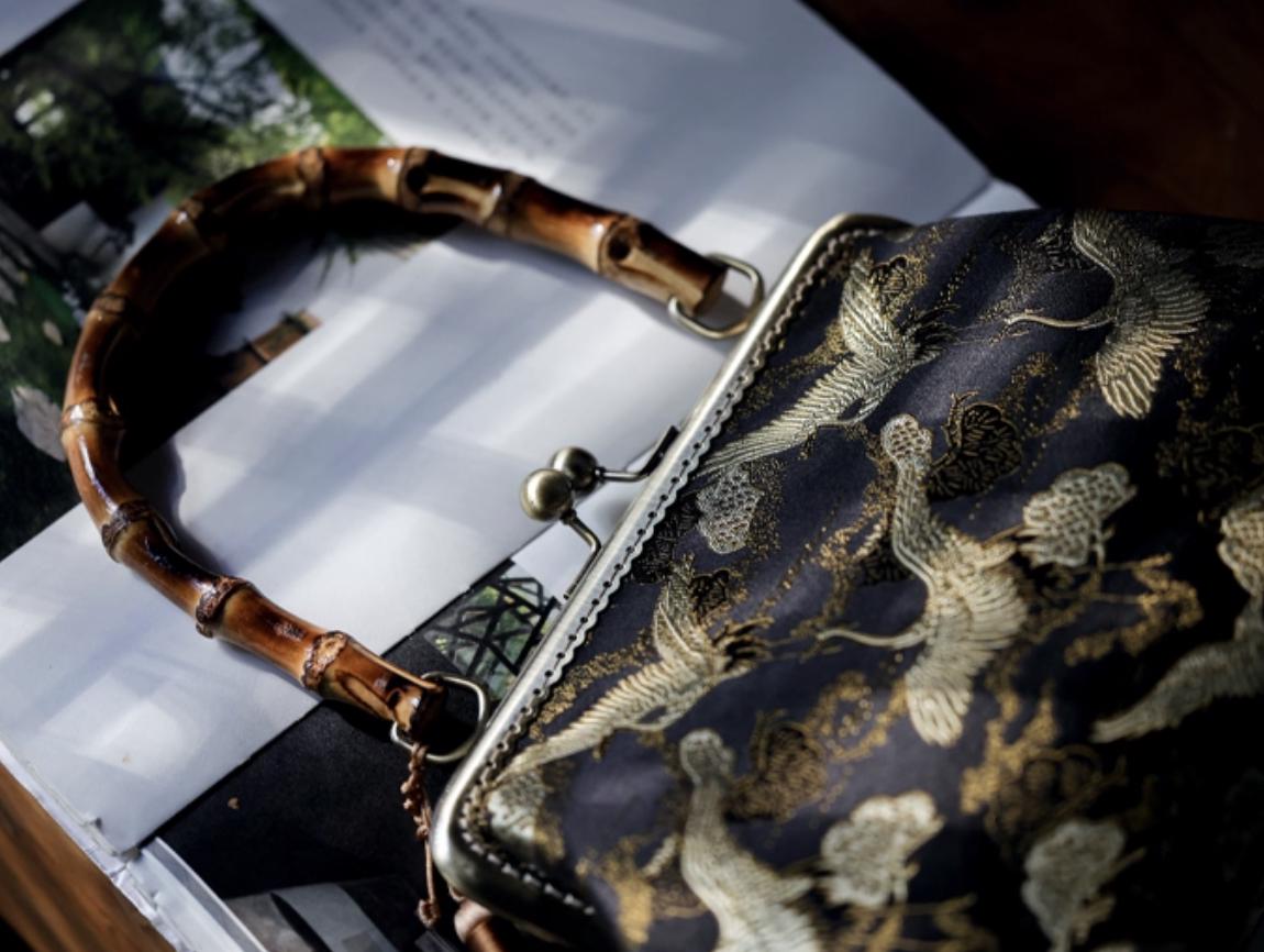 bamboo handle / crane brocade / vintage frame handbag / kiss-lock / wedding & banquet accessory